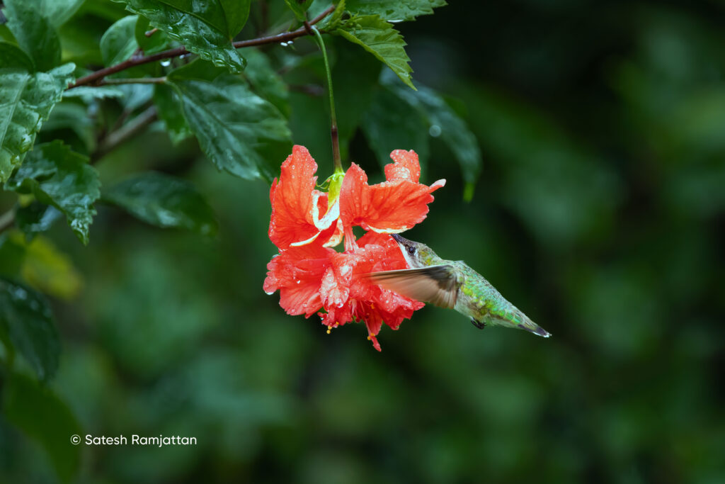 One afternoon, a heavy Florida downpour rolled in — and the hummingbird stayed on her perch. Photographing her in the rain became one of my favorite images.