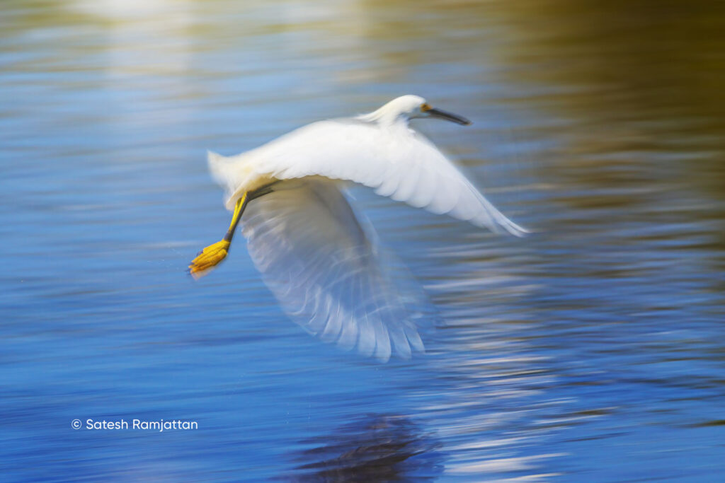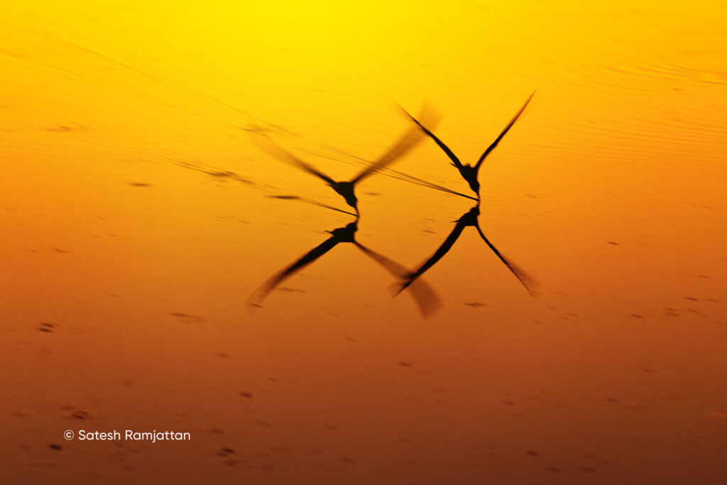 One morning, black skimmers were flying through bright orange reflections. I experimented with slow shutter speeds between 1/40–1/60 second to create abstract motion blur images, a creative approach when light is low.