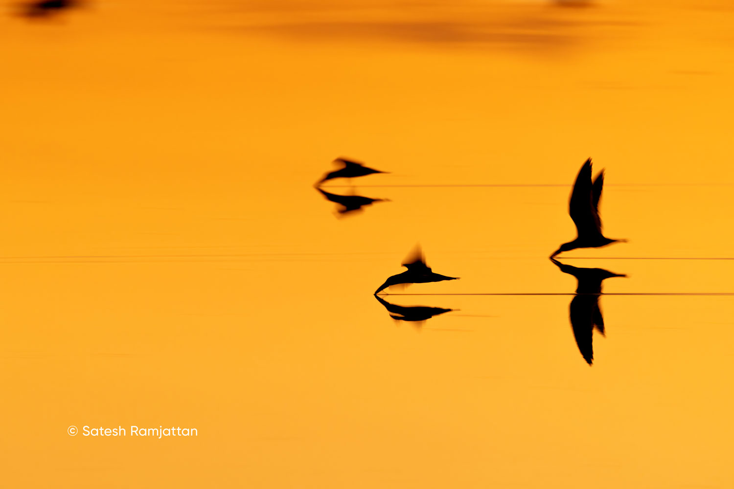 One morning, black skimmers were flying through bright orange reflections. I experimented with slow shutter speeds between 1/40–1/60 second to create abstract motion blur images, a creative approach when light is low.